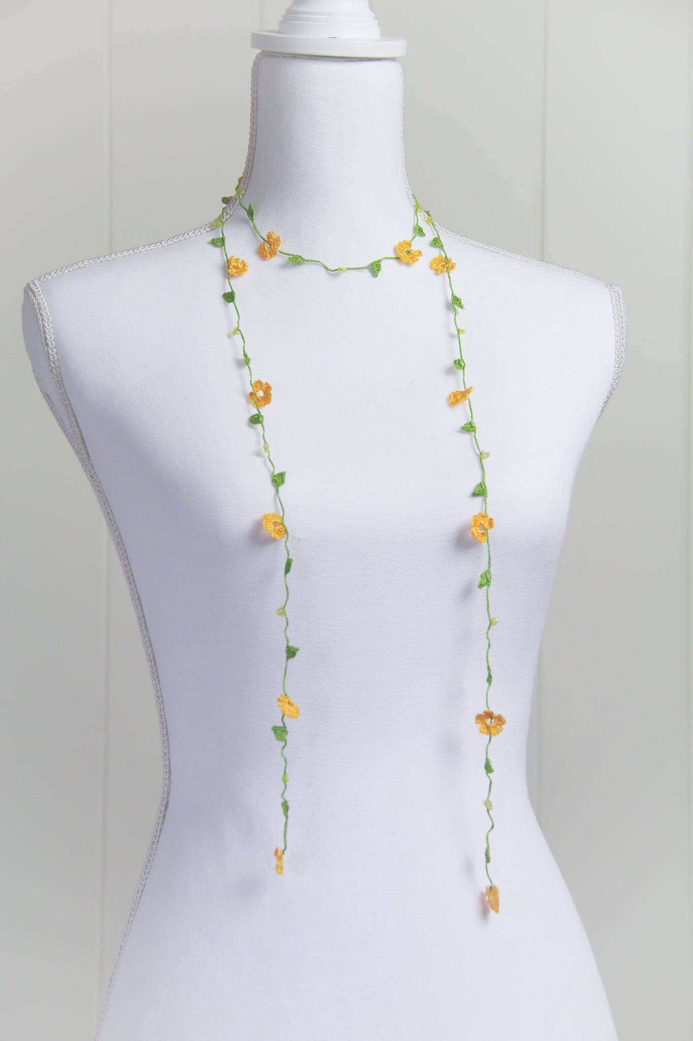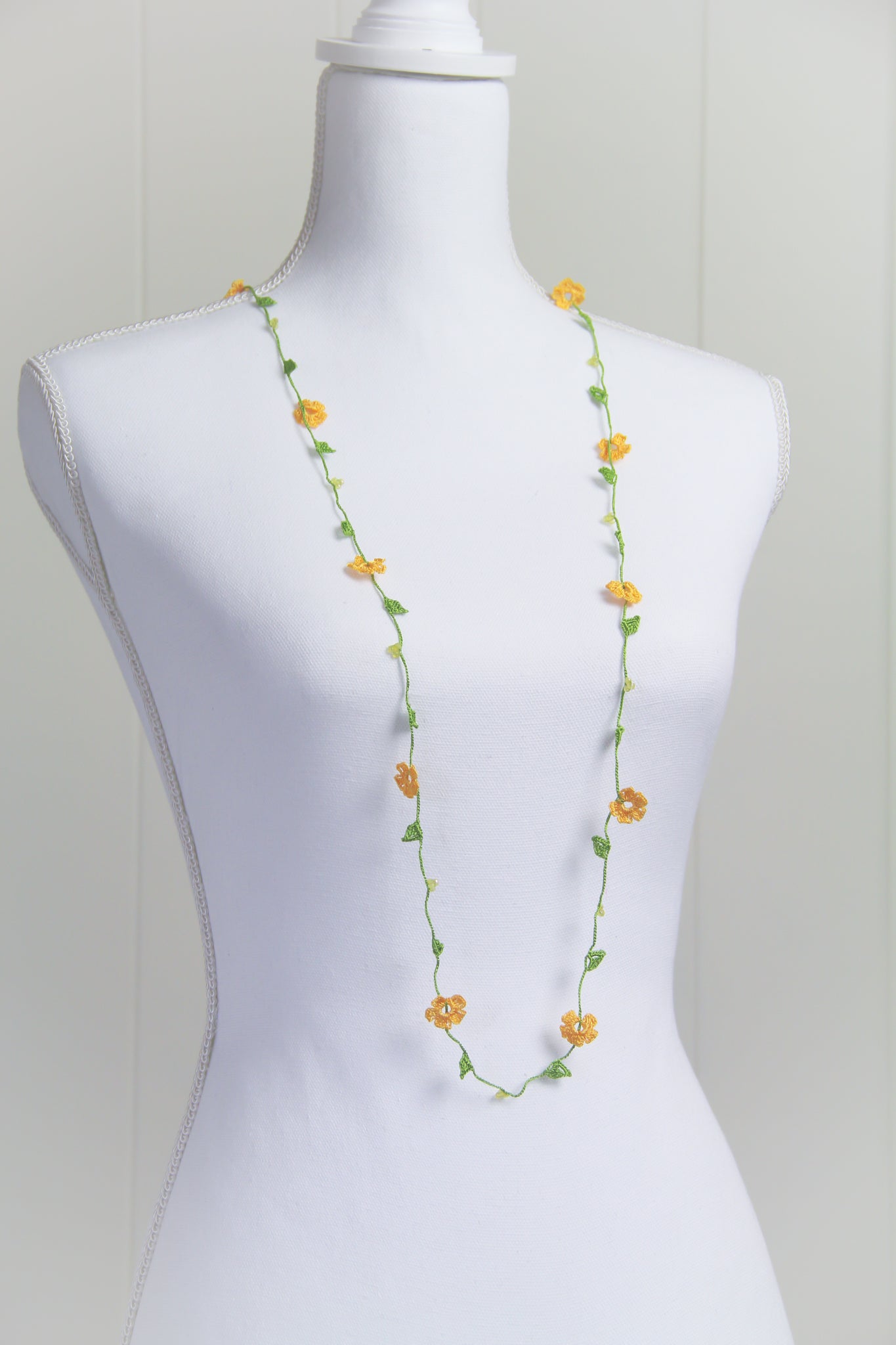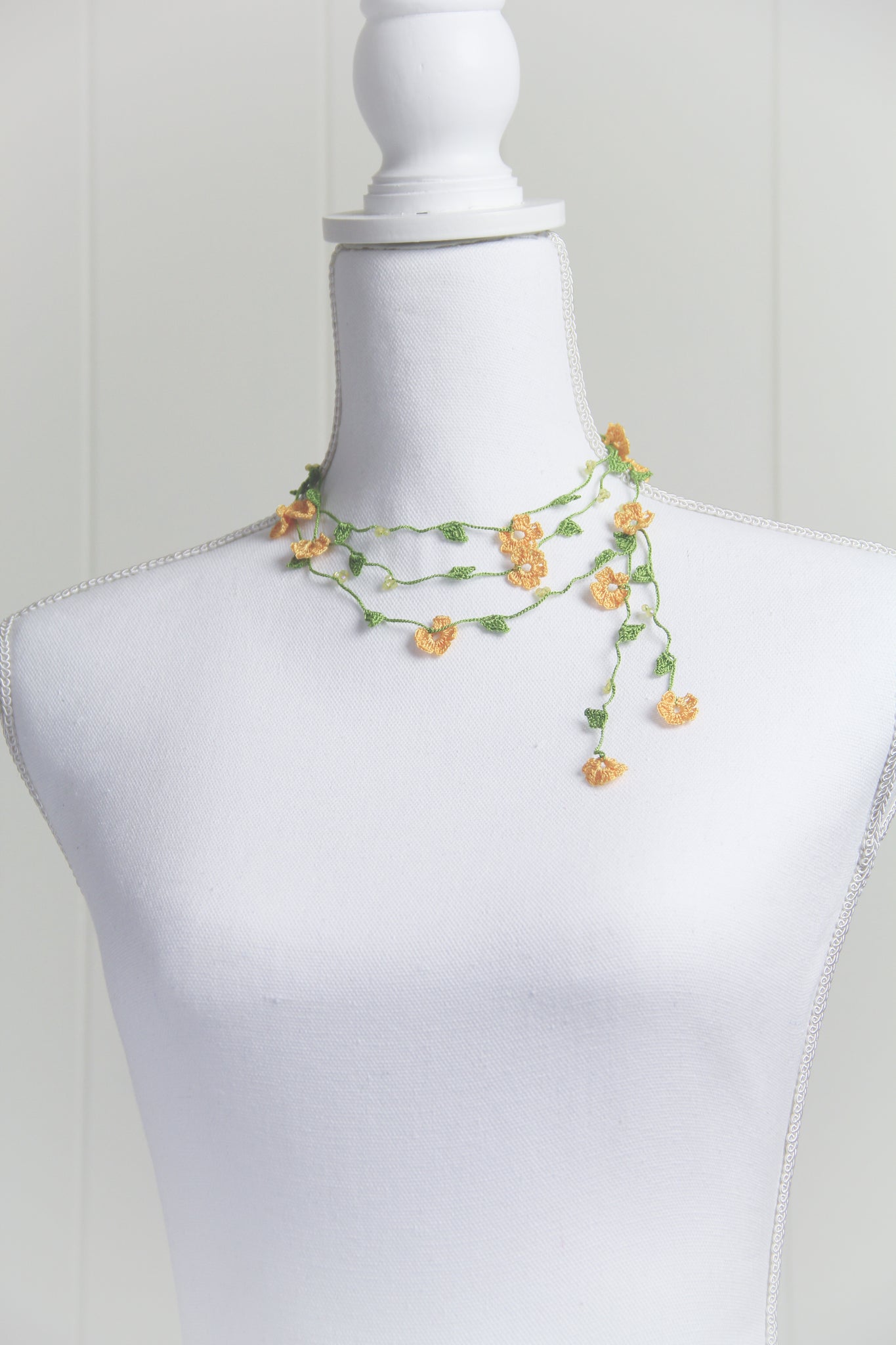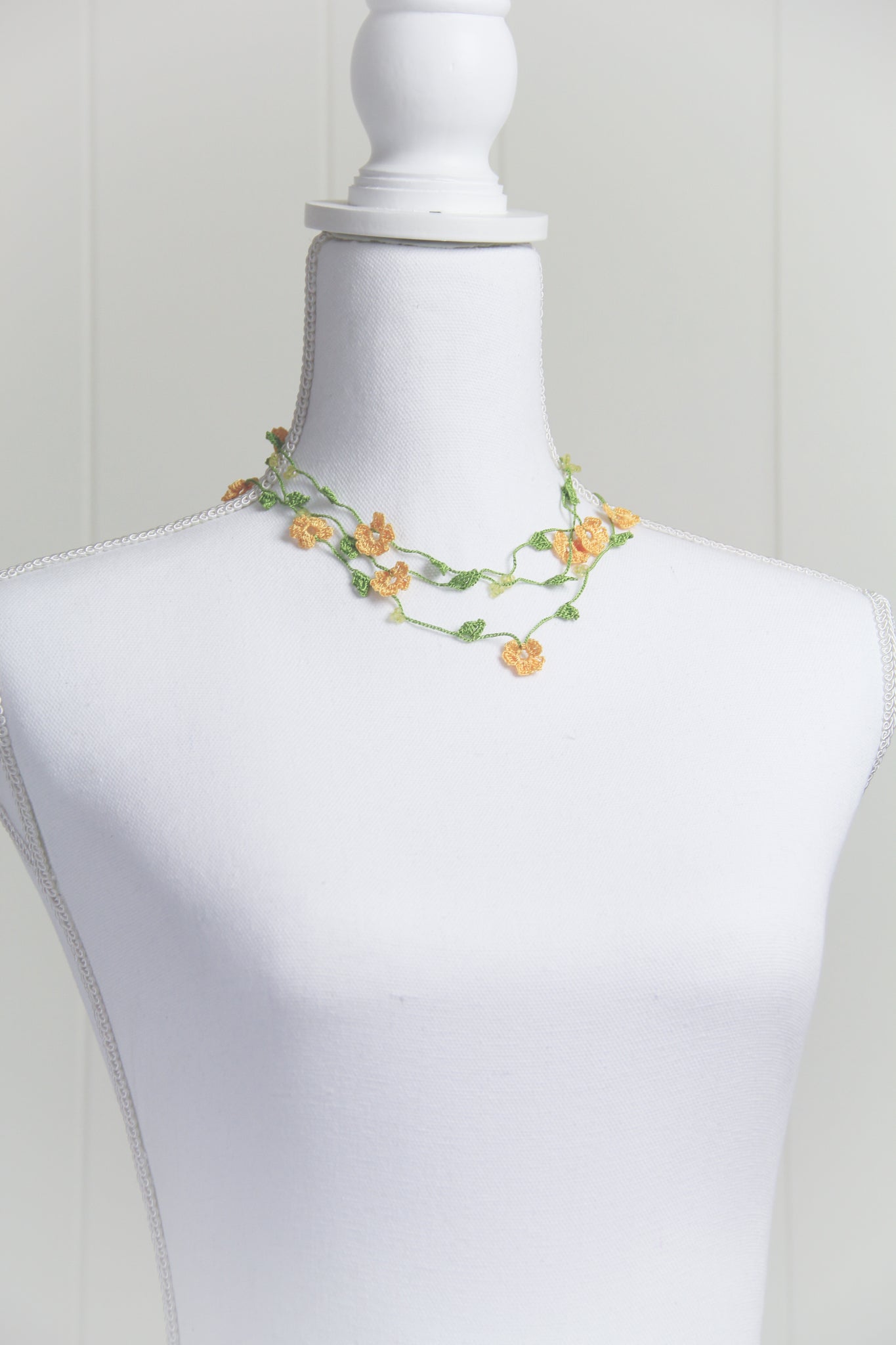 If needed, item can be gently hand washed with mild soap & water. Lay flat to dry. Iron on low heat while necklace is slightly damp. Use a clean white cotton cloth between iron and necklace. A spray starch can be used to add stiffness to the flowers.