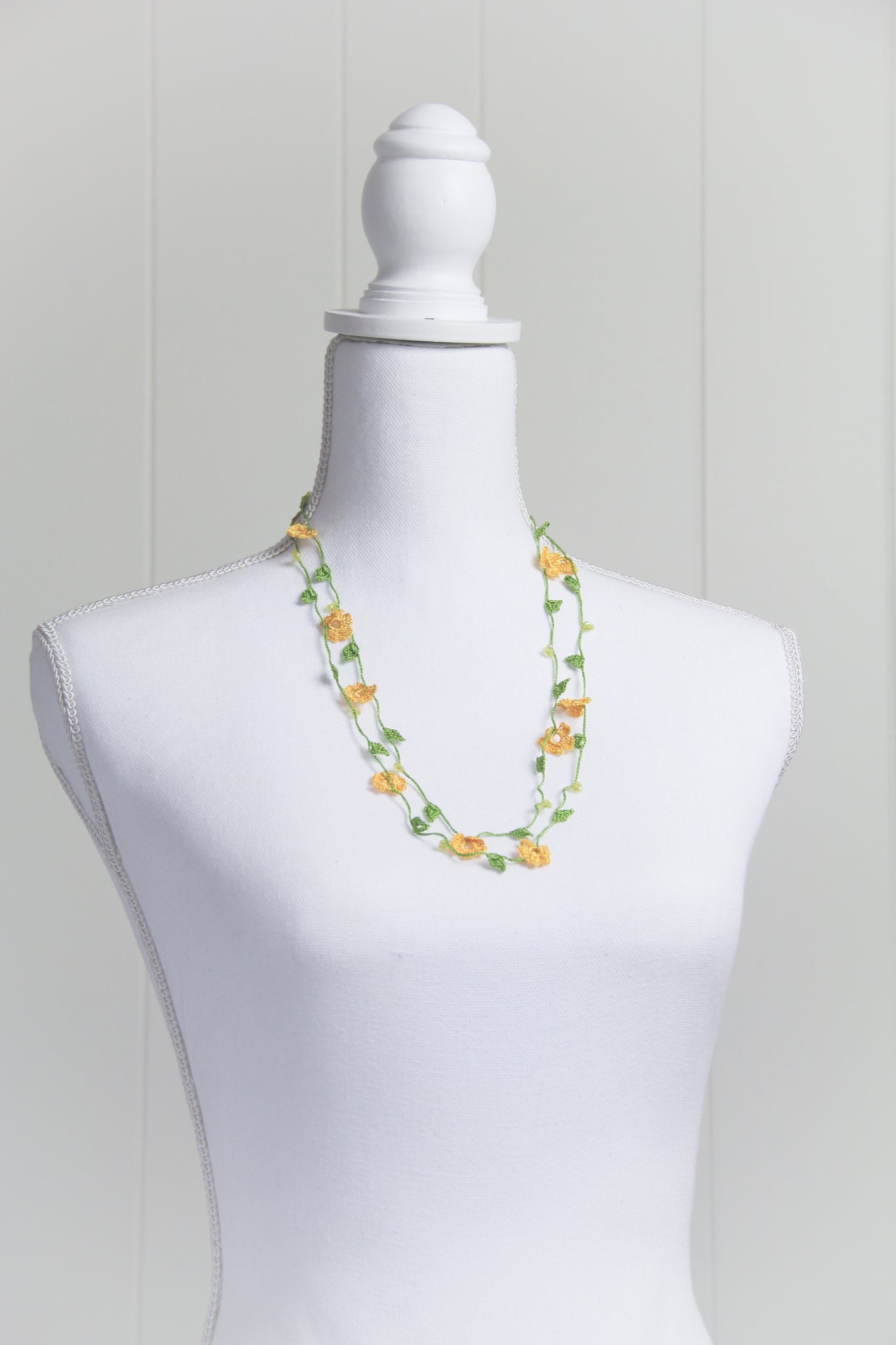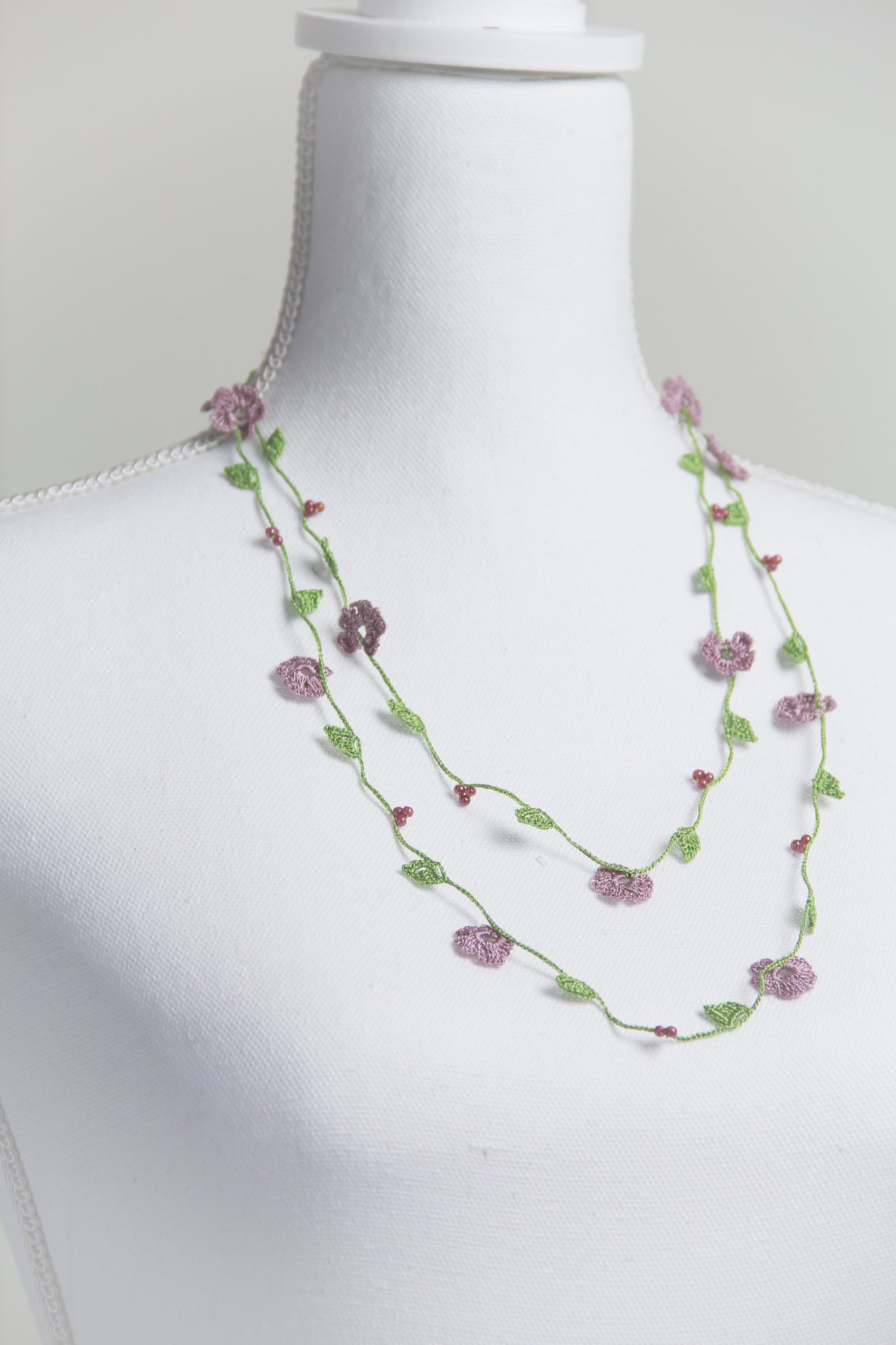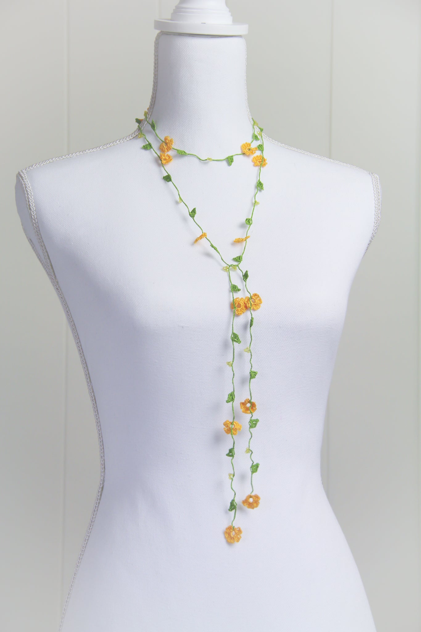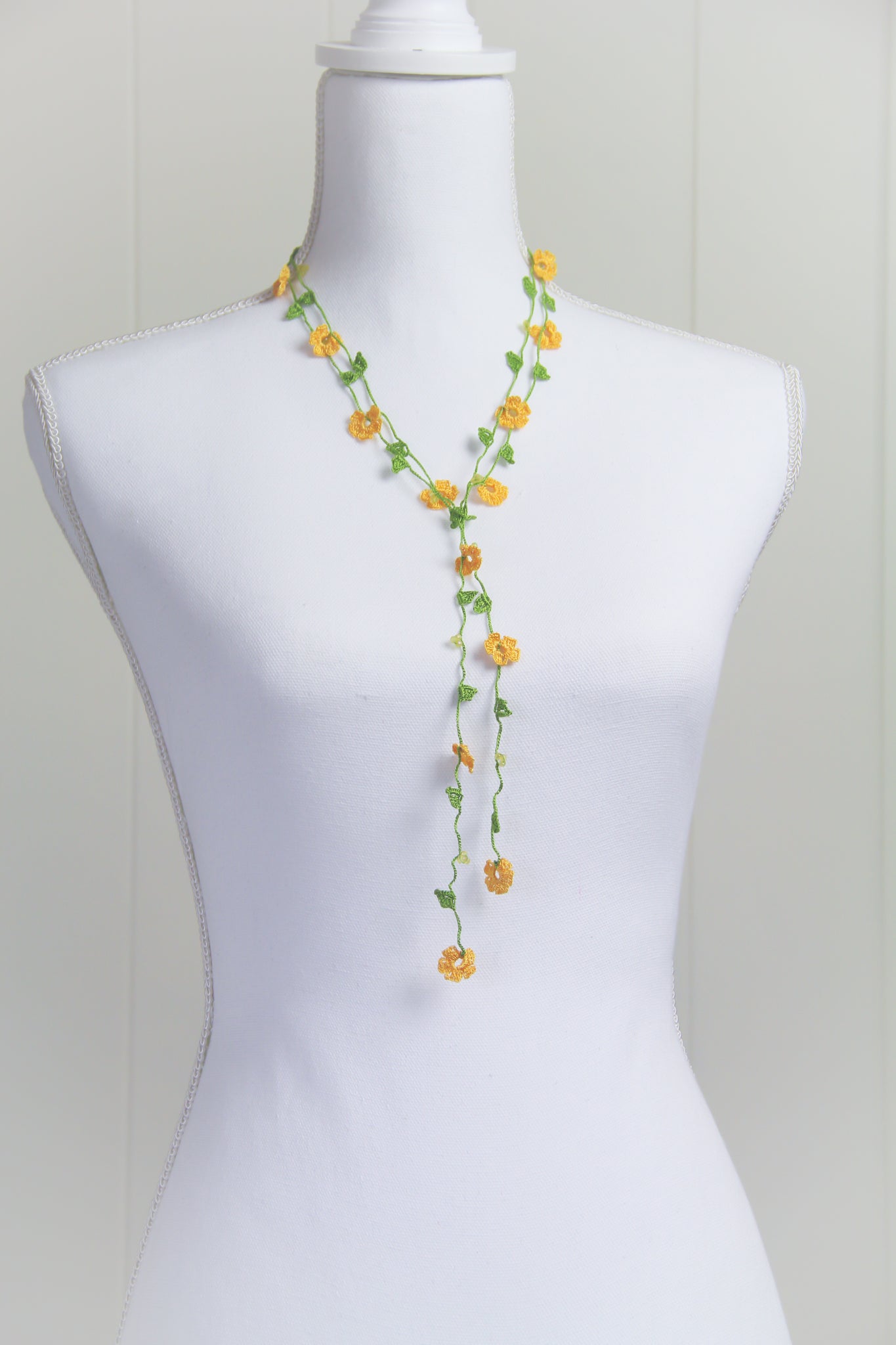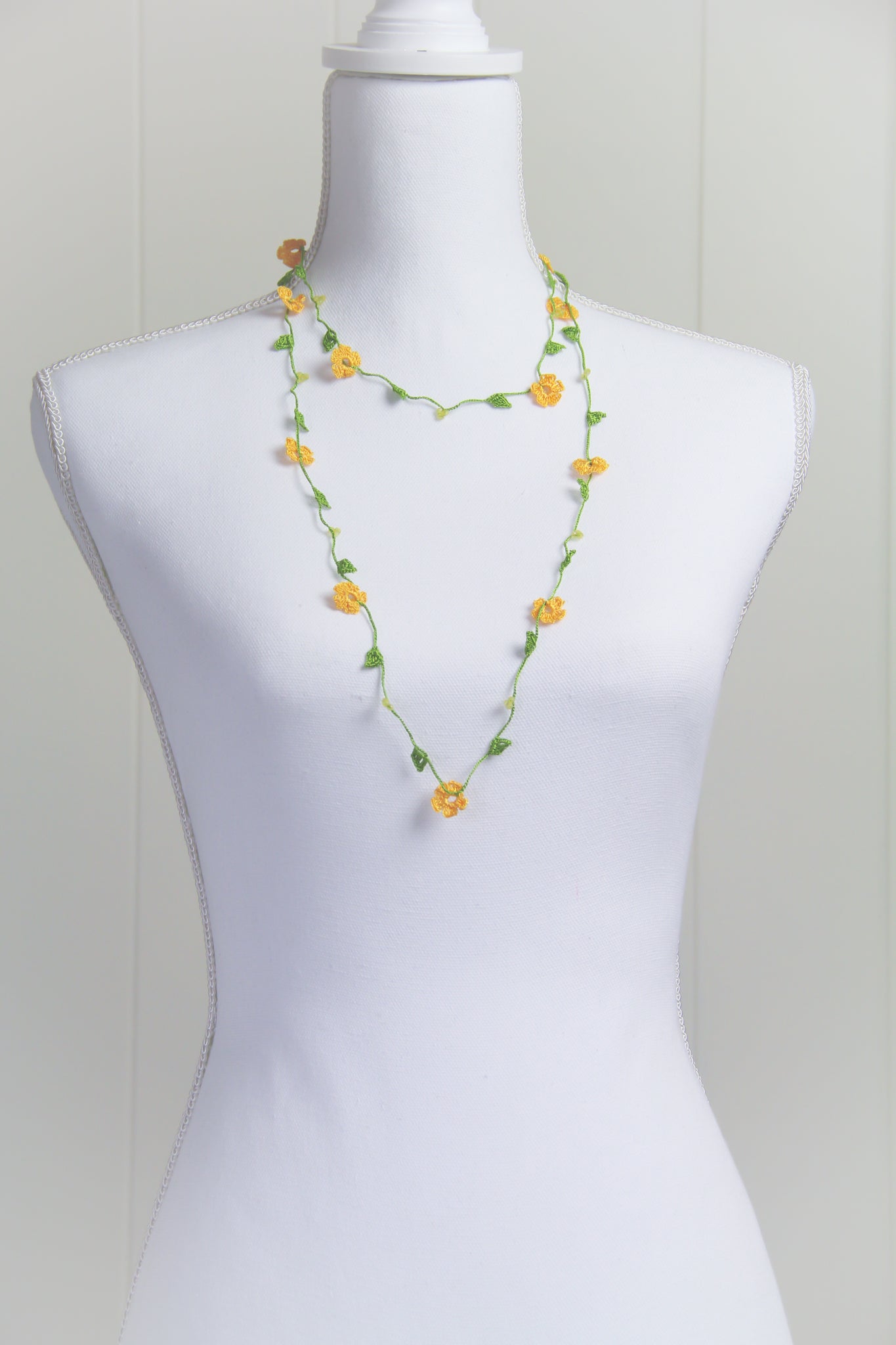 If needed, item can be gently hand washed with mild soap & water. Lay flat to dry. Iron on low heat while necklace is slightly damp. Use a clean white cotton cloth between iron and necklace. A spray starch can be used to add stiffness to the flowers.