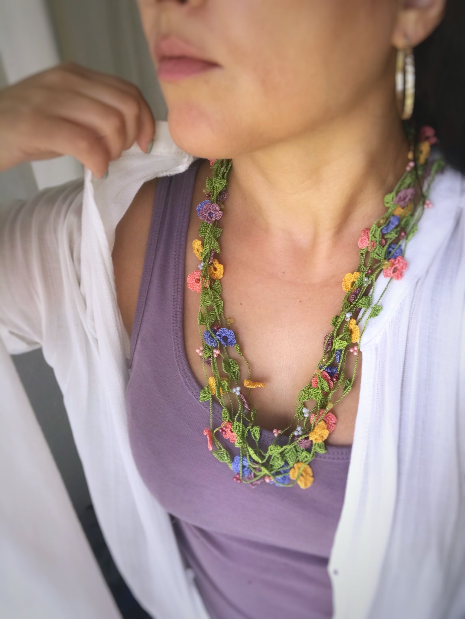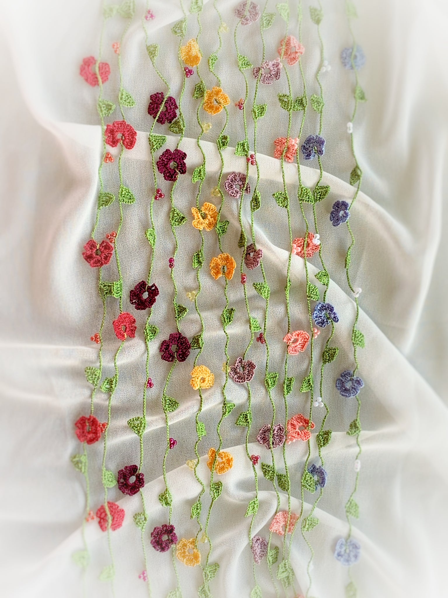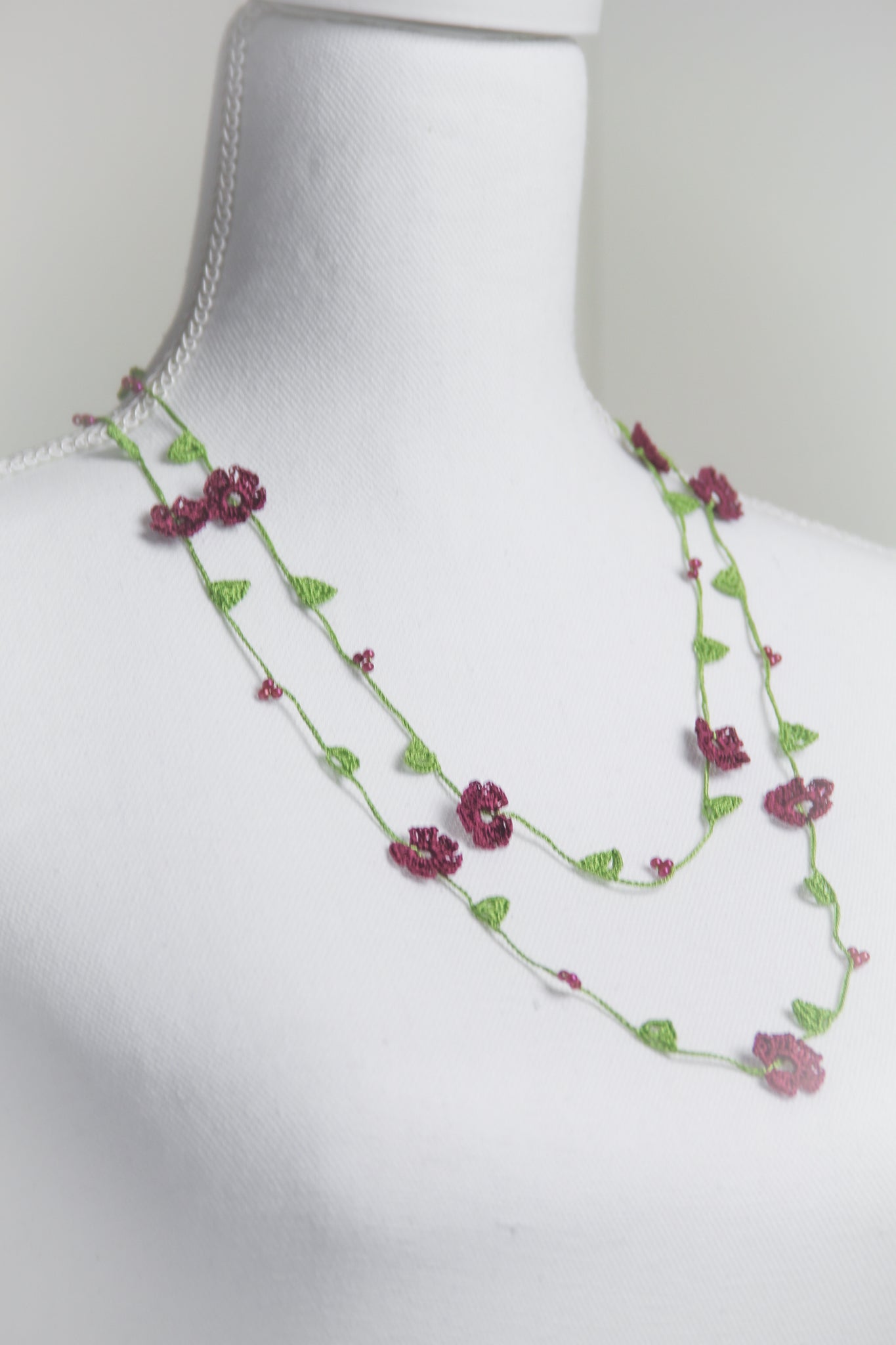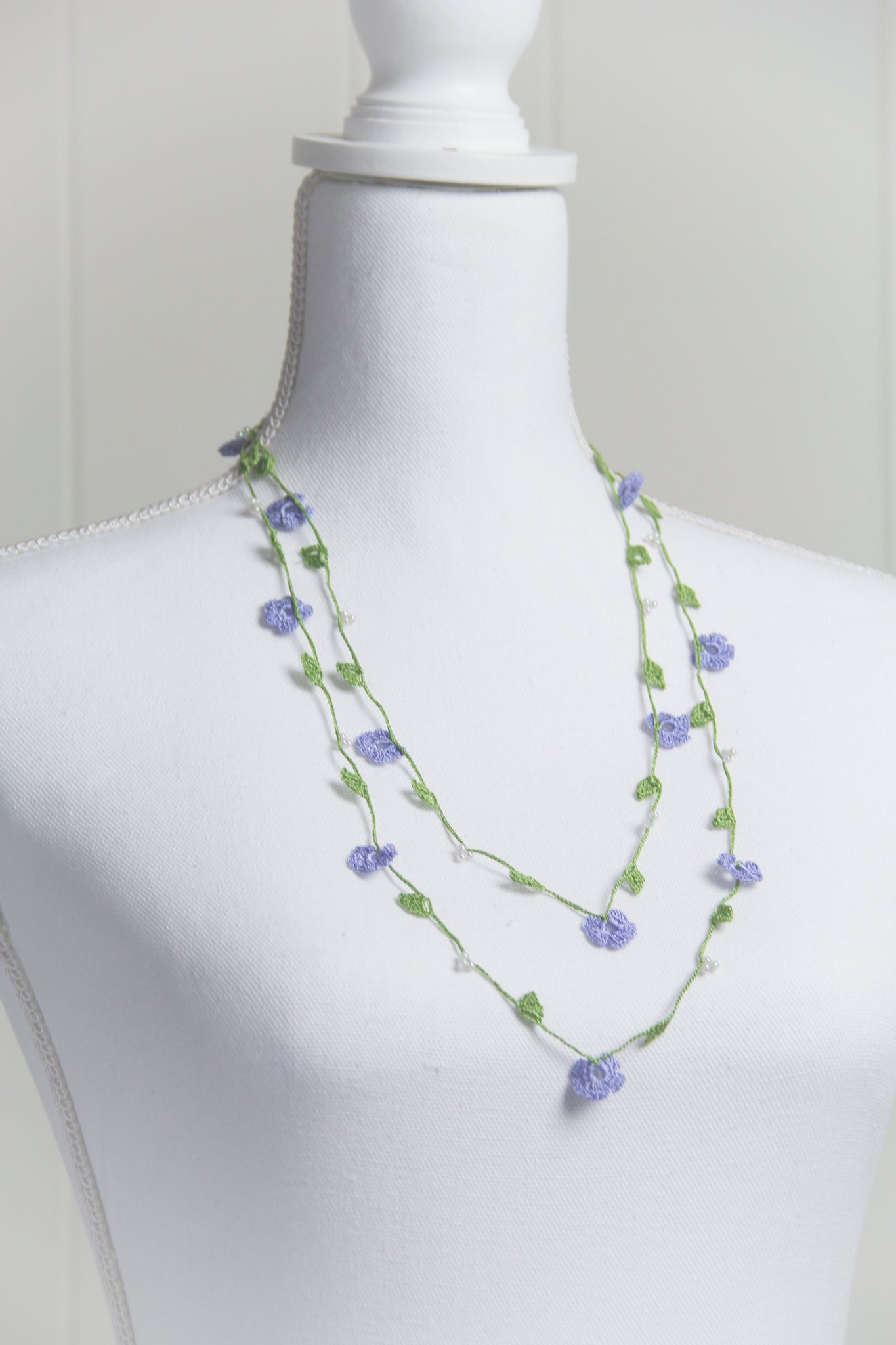 If needed, item can be gently hand washed with mild soap & water. Lay flat to dry. Iron on low heat while necklace is slightly damp. Use a clean white cotton cloth between iron and necklace. A spray starch can be used to add stiffness to the flowers.