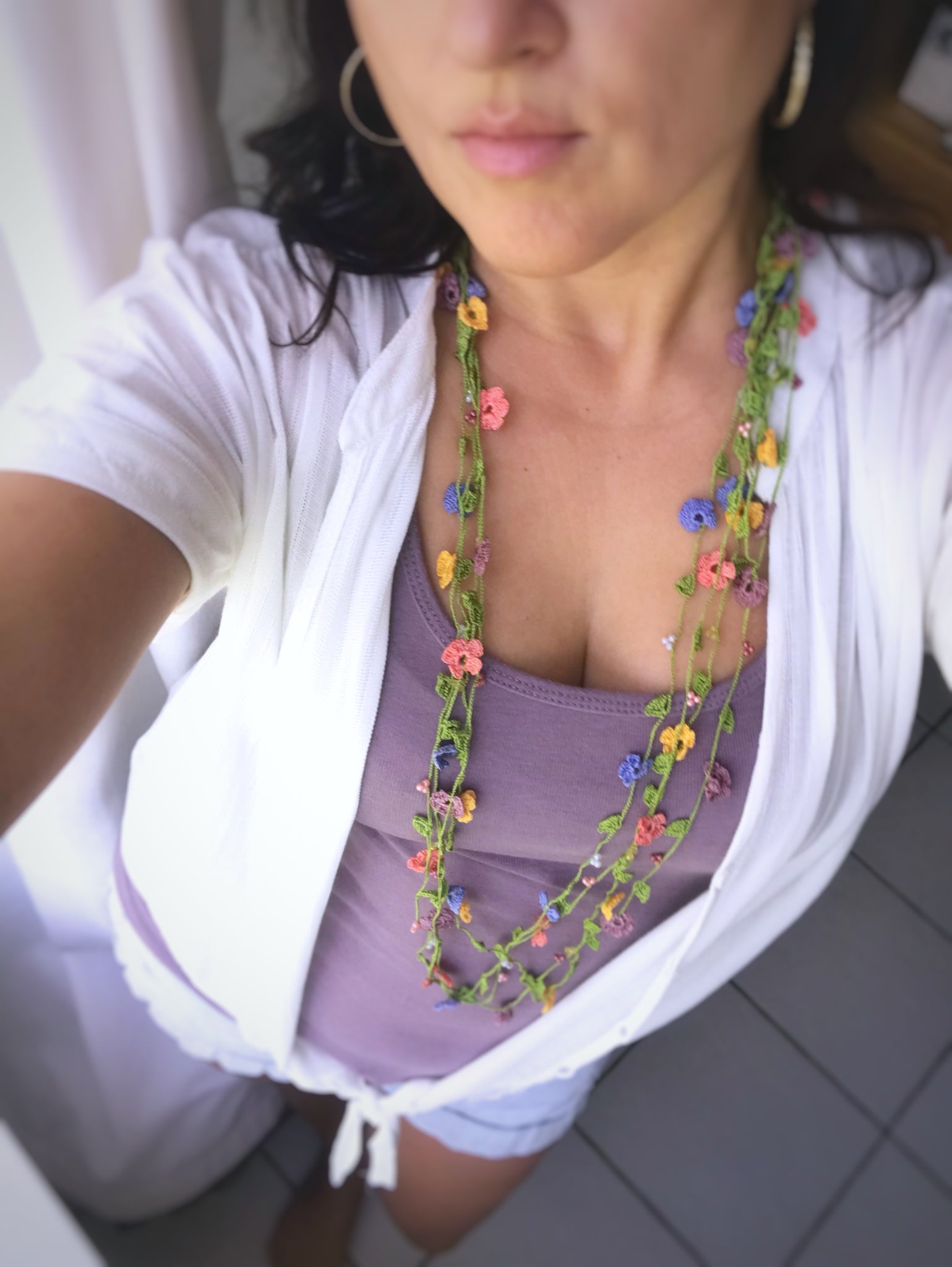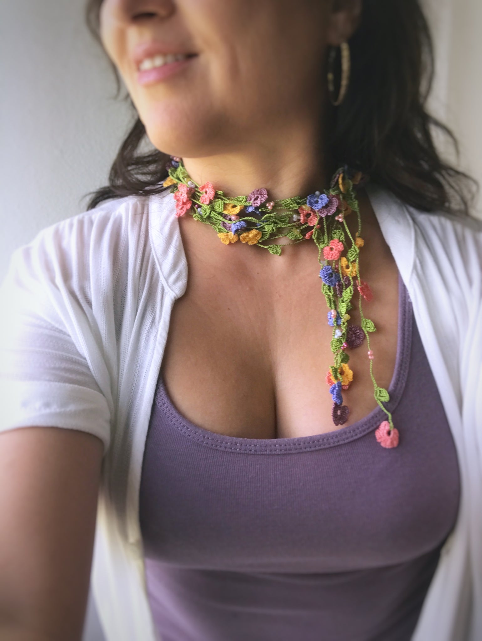 Delicate petite daises decorate this simple, yet colorful lariat necklace.